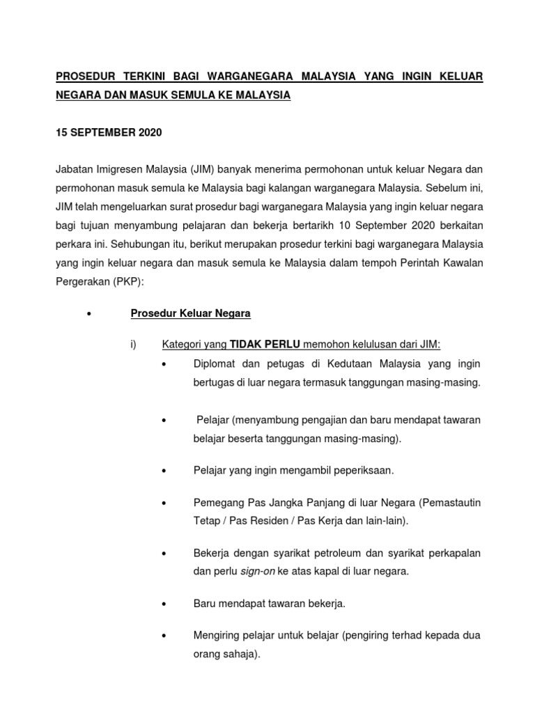 Prosedur Warga Msia Keluar Negara N Masuk Semula 22 September 2020 Pdf