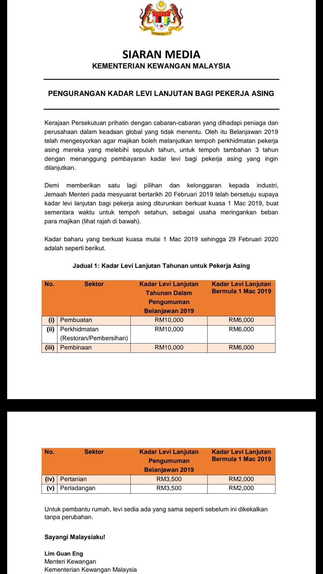 Amanda Lopez No Twitter Kadar Levi Lanjutan Bagi Pekerja Asing Yang Bekerja Melebihi 10 Tahun Diturunkan Ke Rm6 000 Berbanding Rm10 000 Berkuat Kuasa 1 Mac 2019 Buat Sementara Waktu Untuk Tempoh Setahun Mofmalaysia